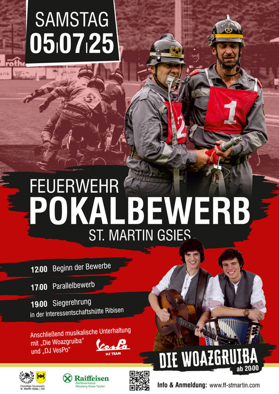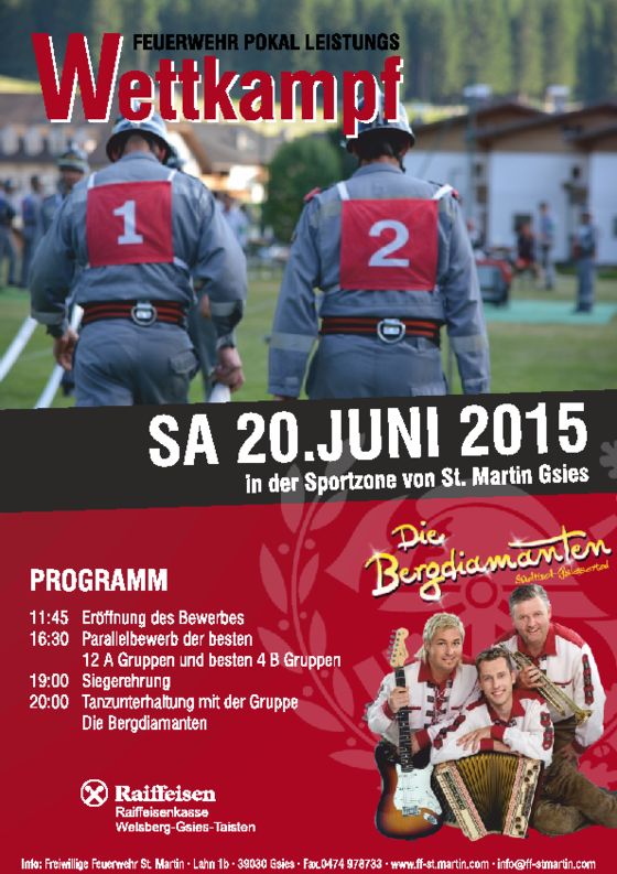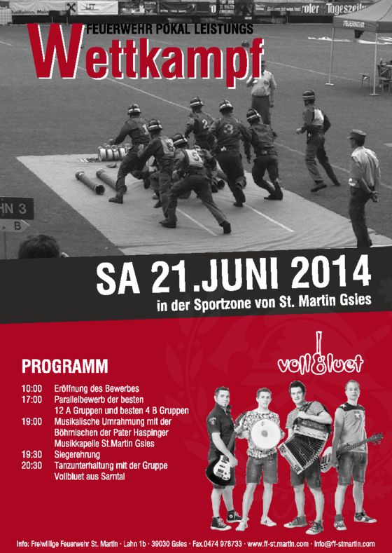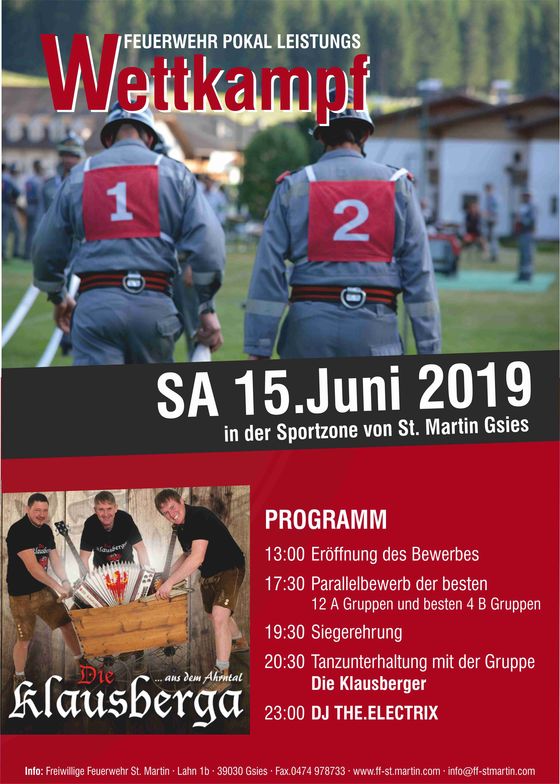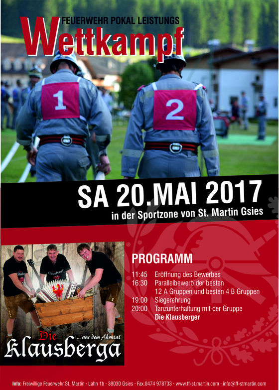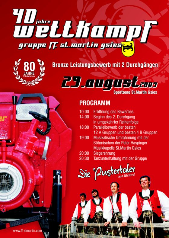 Feuerwehr Pokal Leistungsbewerb 2025Feuerwehr Pokal Leistungsbewerb 2025 in St. Martin Gsies am 05.07.2025 Feuerwehr Pokal Leistungsbewerb 2019Feuerwehr Pokal Leistungsbewerb 2019 in St. Martin Gsies am 15.06.2019 Pokalleistungsbewerb 2017Feuerwehr Pokal Leistungsbewerb 2017 in St. Martin Gsies am 20.05.2017 Pokalleistungsbewerb 2015Feuerwehr Pokal Leistungsbewerb 2015 in St. Martin Gsies am 20.06.2015 Pokalleistungsbewerb 2014Feuerwehr Pokal Leistungsbewerb 2014 in St. Martin Gsies am 21.06.2014 40 Jahre Wettkampfgruppe St. MartinVor 40 Jahren hat die Tätigkeit unserer Wettkampfgruppen begonnen und hat seitdem an vielen Wettkämpfen teilgenommen. Höhepunkte der 40 vergangenen Jahre sind mit Sicherheit die Siebenfache Teilnahme an den verschiedenen Feuerwehrolympiaden. Am 29.08.2009 organisierem wir zu unserem Jubiläum den 1. Gsieser Wettkampf. |