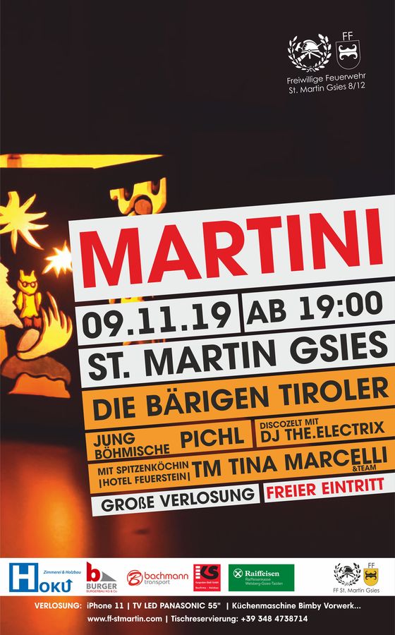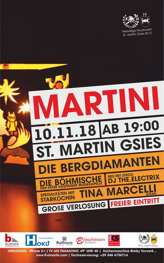 am 10.11.2018 ab 19:00 Uhr im Bürgerhaus von St. Martin GsiesUnterhaltung mit der Böhmischen der Pater Haspinger Musikkapelle, den Bergdiamanten und DJ THE ELECTRIX
